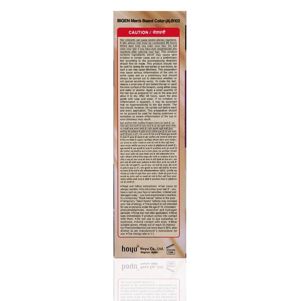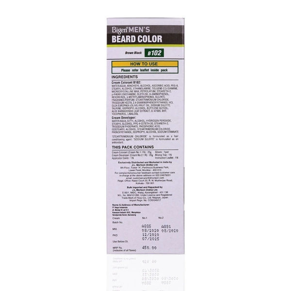Bigen Men's Beard Color B102 Brown Black is a 40 g beard dye that is easy to use and comes with an applicator comb. It is designed to be hydrating and contains three conditioning ingredients to moisturize and add shine. The dye is also ammonia-free and enriched with olive oil and taurine. It can be applied to any part of the beard and is said to cover grays without staining the skin.
