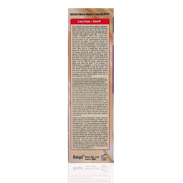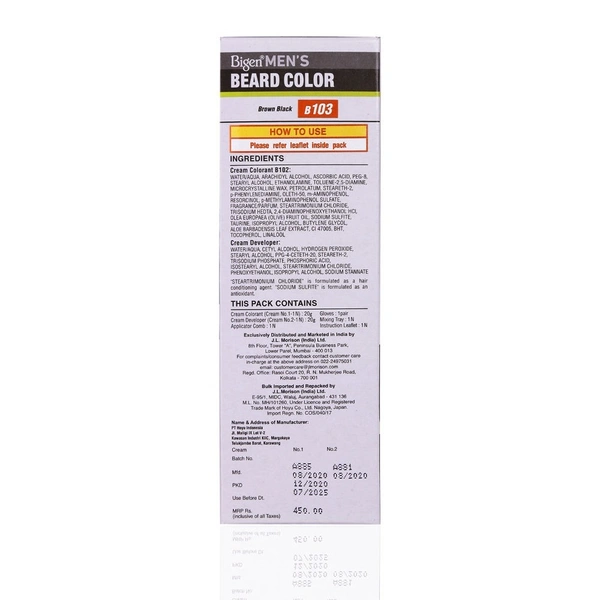 Bigen Men's Beard Color B103 Dark Brown is a 40 g beard dye that is easy to use and comes with an applicator comb. It is designed to be hydrating and contains three conditioning ingredients to moisturize and add shine. The dye is also ammonia-free and enriched with olive oil and taurine. It can be applied to any part of the beard and is said to cover grays without staining the skin.