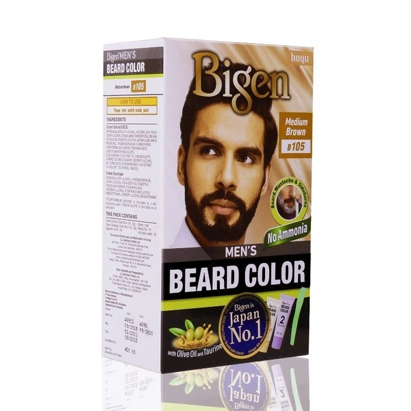 Bigen Men's Beard Color B105 Medium Brown is a 40 g beard dye that is easy to use and comes with an applicator comb. It is designed to be hydrating and contains three conditioning ingredients to moisturize and add shine. The dye is also ammonia-free and enriched with olive oil and taurine. It can be applied to any part of the beard and is said to cover grays without staining the skin.