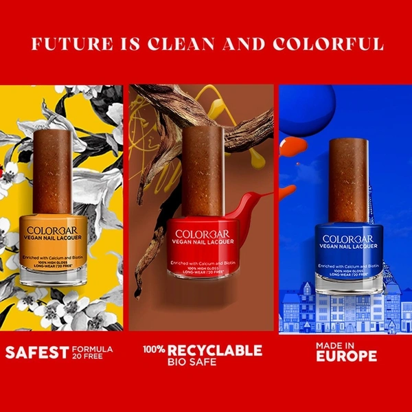 After bagging two Guinness World records, Colorbar is now set to achieve more and beyond with a whole new take on giving back to Mother Earth. Our new patented Vegan Nail Lacquer is a 100% Clean Beauty initiative towards Green Environment. Made with love and nourishment of Biotin and Calcium, our 20 FREE formula is non-toxic, non-carcinogenic, non-yellowing, non-chipping, and free from animal derived pigments. We have also replaced our 100% plastic caps with bio-safe, eco-friendly and sustainable cap made of 50% wood to reduce and control plastic waste.