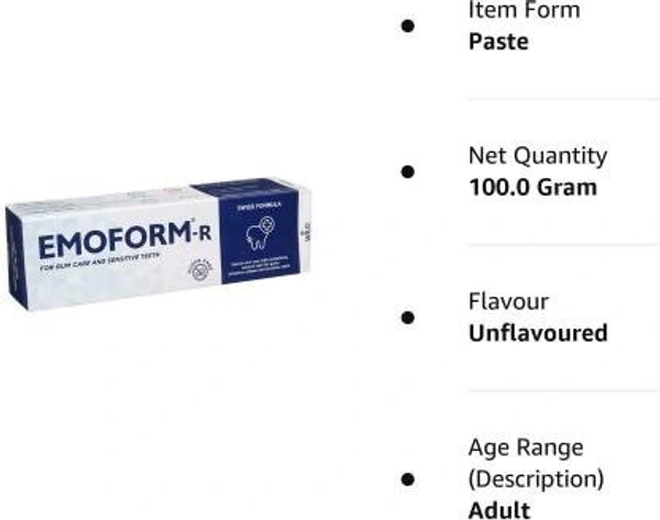 Emoform R Toothpaste contains calcium carbonate and potassium nitrate as active ingredients. Emoform R Toothpaste is a foaming non- fluoridated multifunctional toothpaste that helps to reduce teeth sensitivity and prevent plaque formation.