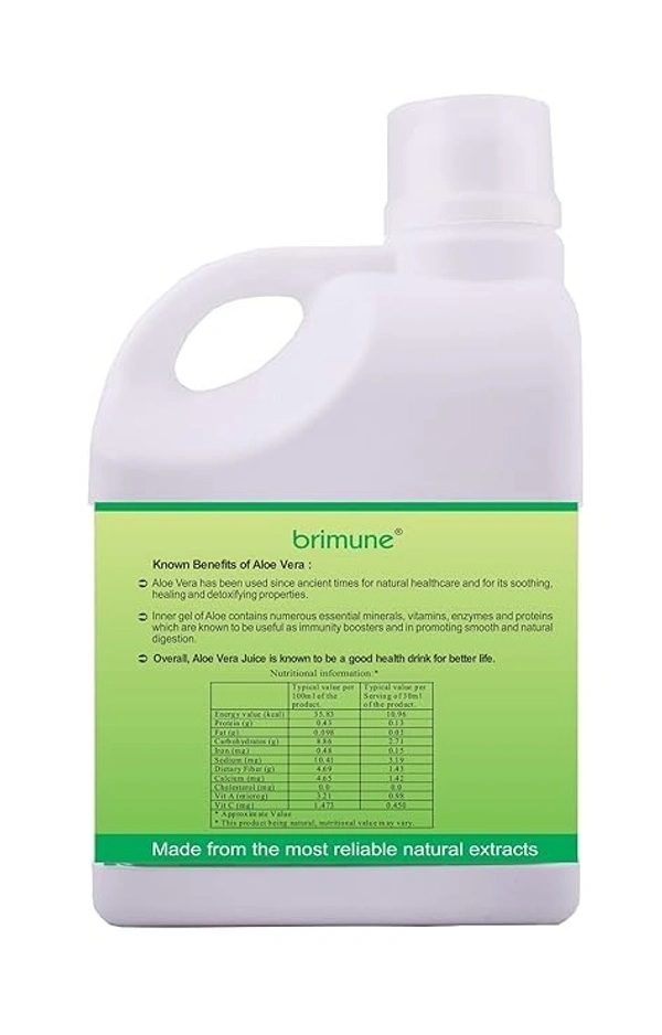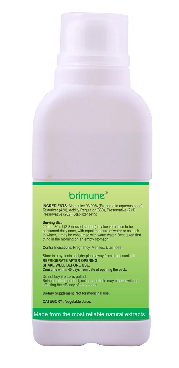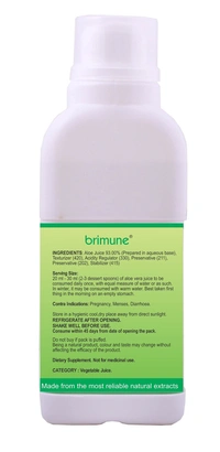 Brimune Aloe Vera Juice is a natural juice that contains 93% aloe vera and is known to boost the immune system. The inner gel of aloe vera contains vitamins, minerals, enzymes, and proteins that can help with digestion and immunity. Aloe vera juice also has antibacterial, antioxidant, and anti-inflammatory properties.