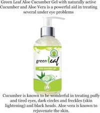Greenleaf Aloe Cucumber Gel with naturally active Cucumber & Aloe Vera is known to be wonderful in soothing puffy and tired eyes. Cucumber is known to have skin lightening properties. Cucumber & Aloe Vera have a cooling effect on the skin and keep the skin hydrated.