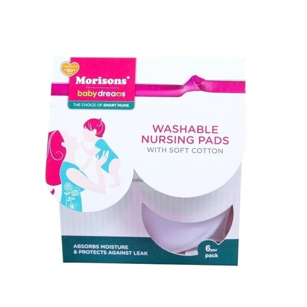 Morisons Baby Dreams Washable Nursing Pads provides nursing mothers protection against breast milk leakage. These nursing pads are made of pure cotton that quickly absorbs moisture, thus ensuring maximum dryness to make mothers feel comfortable. These reusable nursing pads allow air circulation for maximum comfort. They can be hand or machine washed. The outer layer of the pads resists moisture and protects clothing.