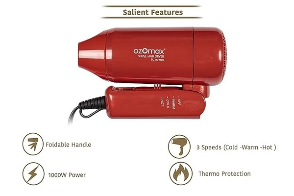 Novel Hot and Cold Hair Dryer comes with 1000W Capacity, Strong Airflow and 3 Speed Settings; Cold, Warm & Hot, which enables you to change temperature of space to your requirement. Additional bonuses include Foldable Handle with Nozzle Attachment.