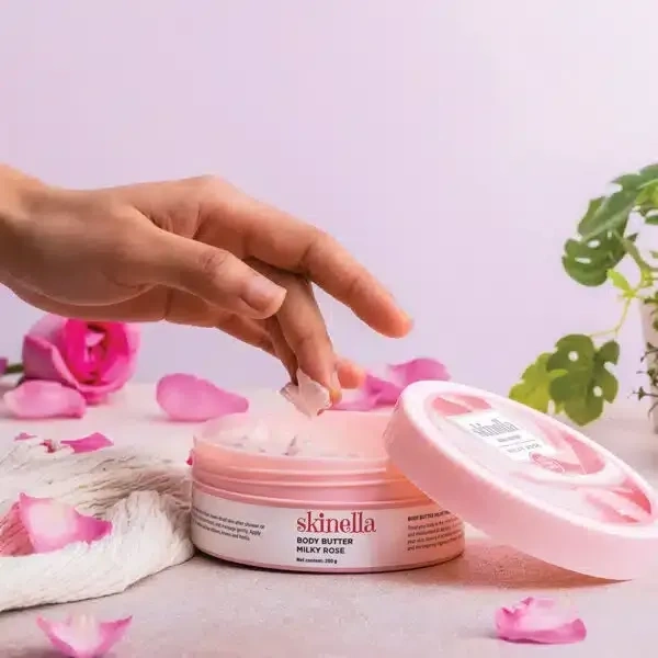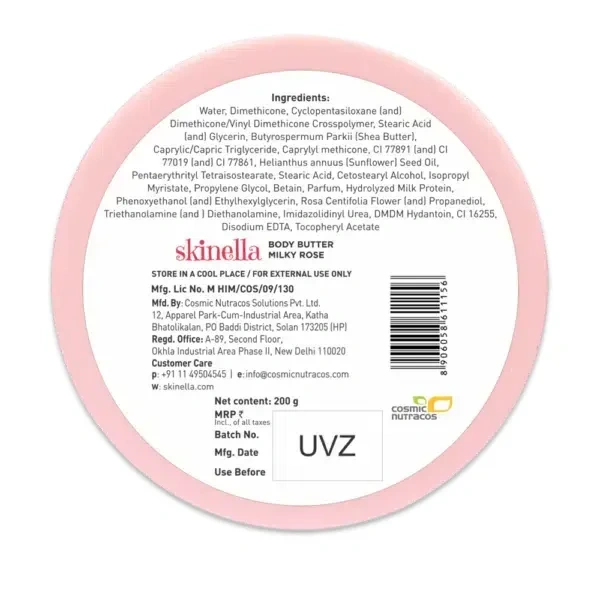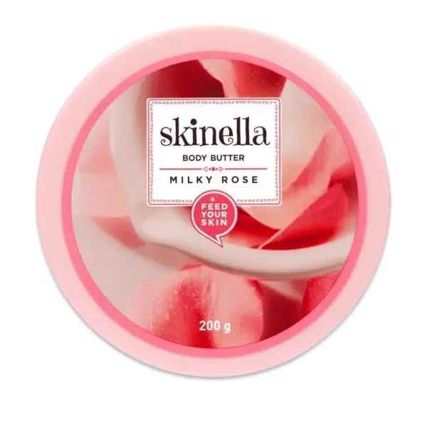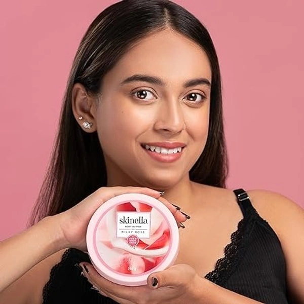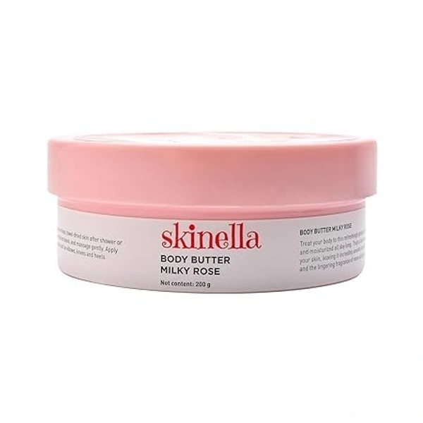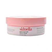 Skinella Milky Rose Body Butter (200 g) is a body moisturizer made with pure rose and milk that is designed to deeply moisturize and nourish the skin. It is said to leave skin feeling silky soft and smooth, and to give off a lingering rose fragrance all day. The body butter is also said to help bring out the skin's inner radiance and glow.