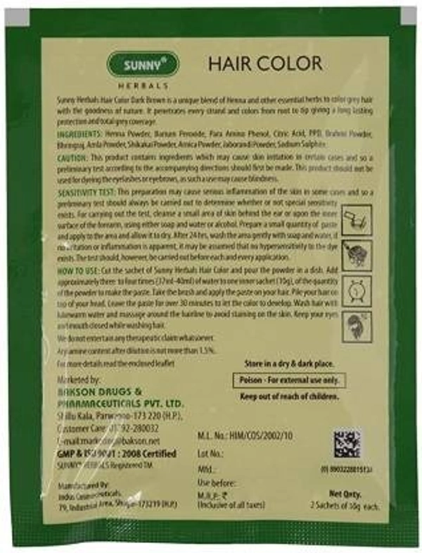 Added goodness of henna, Amla, Shikakai, & Bhrinaraj for total grey coverage. Sunny herbals hair color brown is a unique blend of henna and other essential herbs to color grey hair with the goodness of nature. It pentrates every strand and colors from root to tip giving a long lasting protection and total grey coverage. Bakson Sunny Herbal hair color (brown) comes with the goodness of arnica and jaborandi for natural color, conditioning and shine. Henna known for its natural coloring and conditioning properties along with amla and shikakai make the hair smooth silky and shiny. Bhringaraj conditions hair and prevents dryness. In addition Jaborandi and arnica control premature greying and falling of hair.This hair color can be used on all hair types.